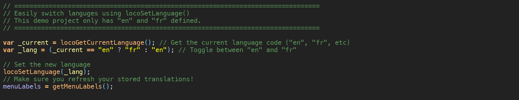 locoSetLanguage("es"); // Switch to Spanish
